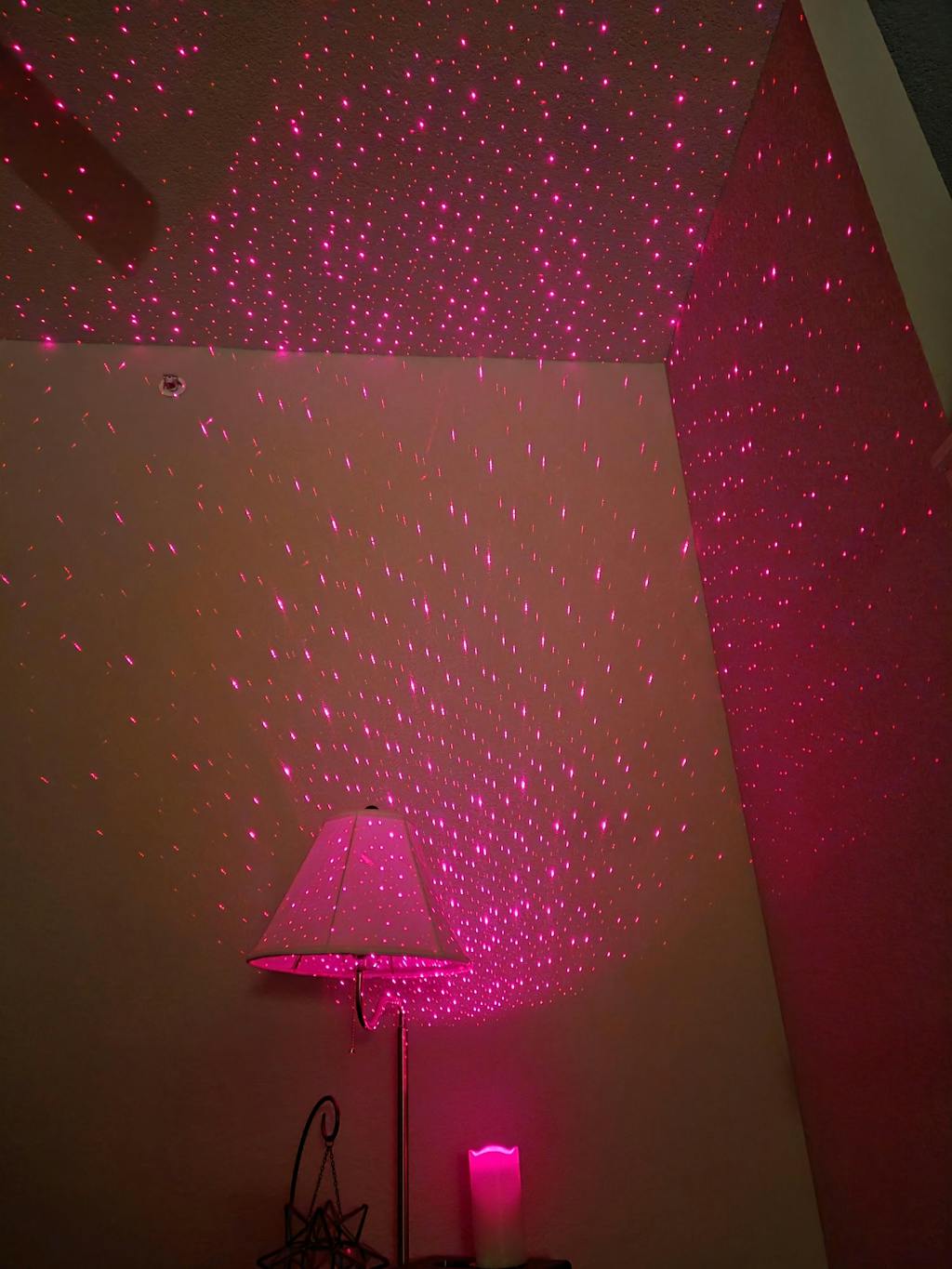 The Night Stars Flameless Laser Candle is a unique and stylish candle equipped with a red laser and flickering LED light. The Night Stars Candle can be battery-operated or plugged into an outlet with the included power adapter. The timer lets you control when the candle starts and stops. Calming, approachable, seductive, and sublime. The laser and LED modes will enhance the surrounding area with just the touch of a button. Flickering like a real wick, the pillar glimmers like a natural candle.